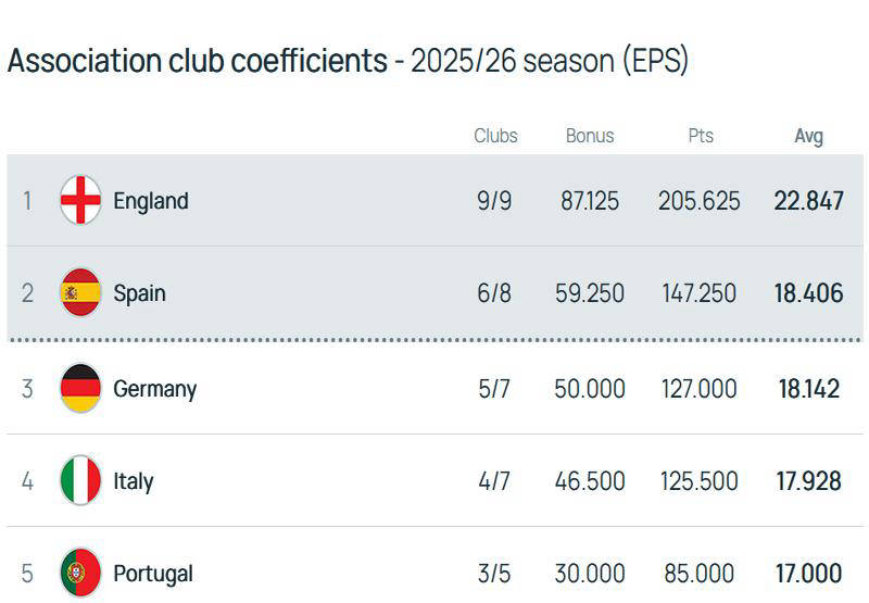 紧随英超之后,西甲、德甲和意甲紧密排布第二至第四名,积分总差距不足0.5分,竞争异常激烈。只要这三个联赛中任何一个能够比对手多派遣一队进入欧冠下一轮,便可缩小积分差距甚至实现超越。因此,两项欧冠积分名额成为三大联赛角逐的重中之重。